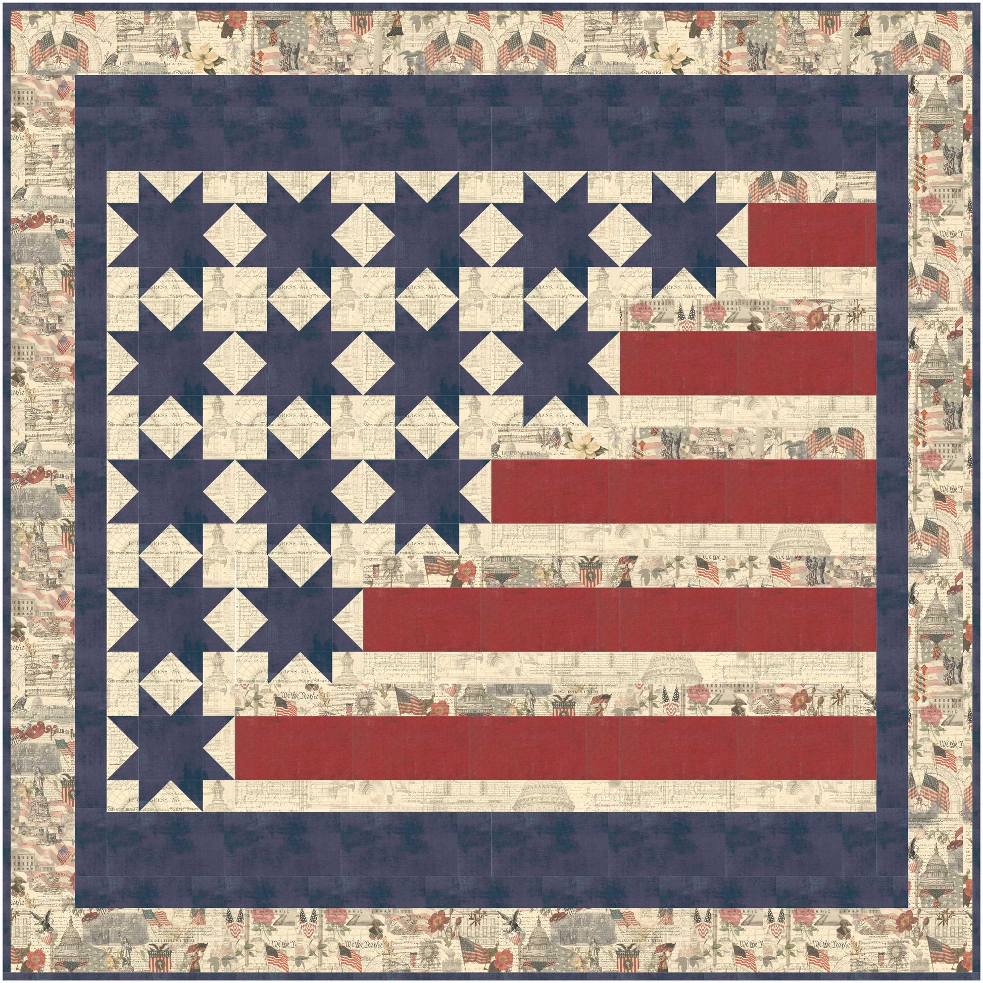 Wrap yourself in patriotic spirit with this striking 60½" x 60½" quilt featuring the beloved Patriotic collection by 3 Sisters Favorite Collages. This expertly crafted design brings together rich, meaningful fabrics that honor American heritage and values. The generous size makes it ideal for cozying up on the couch, draping across a bed, or displaying as a statement piece that showcases your passion for country. Handmade with care and attention to detail, this quilt transforms any space into a patriotic sanctuary. Own a piece that tells a story of pride and tradition.